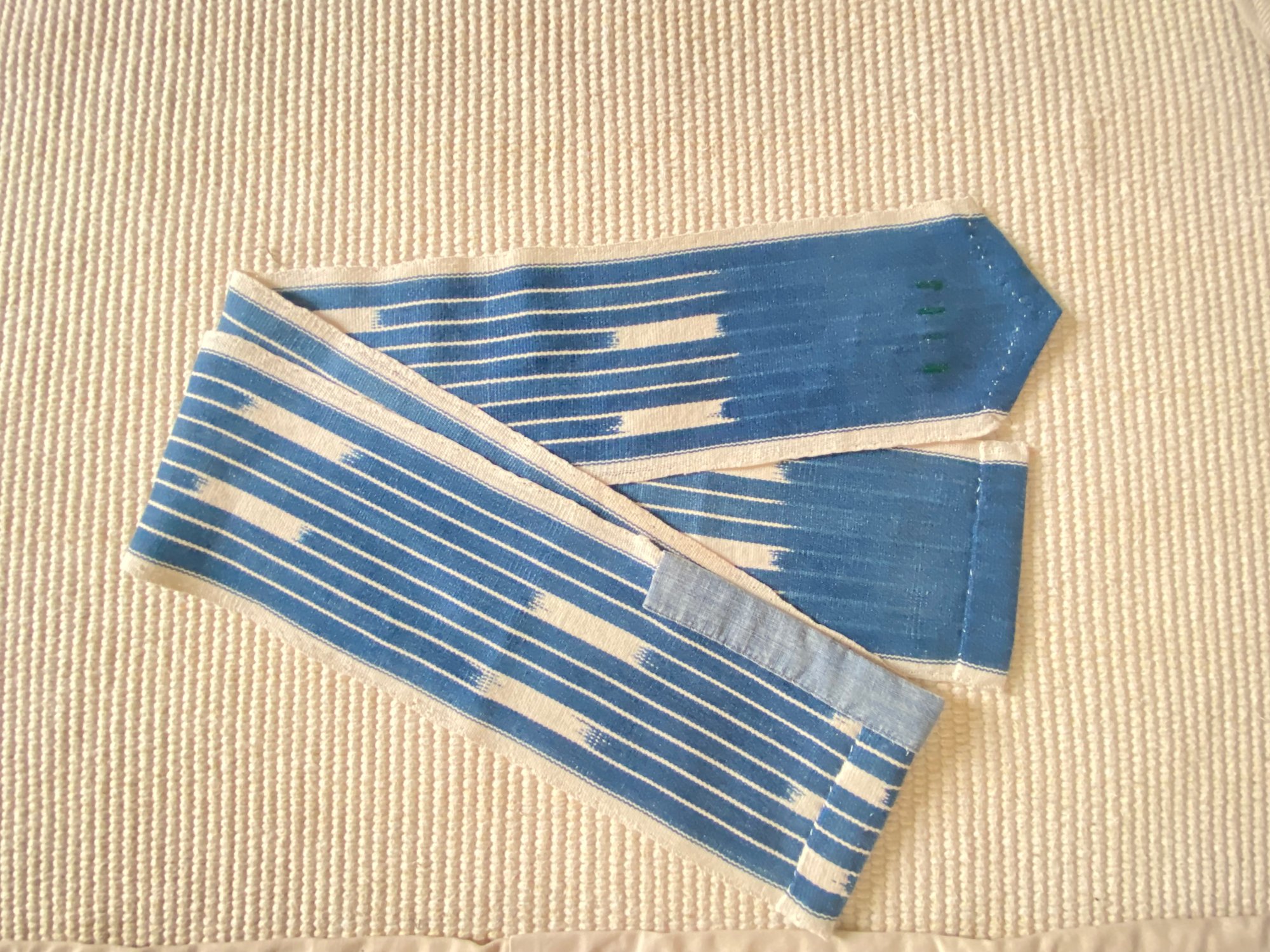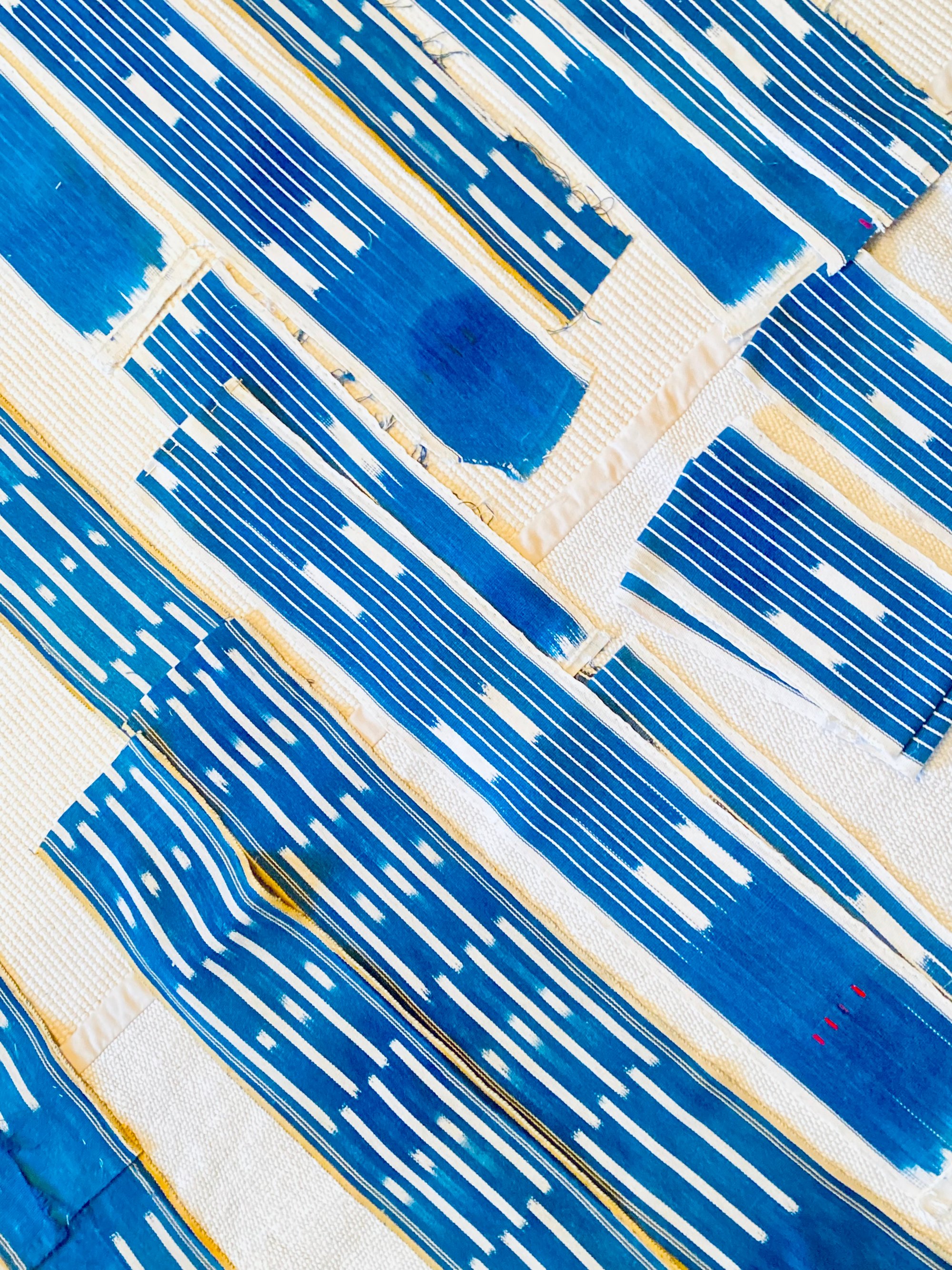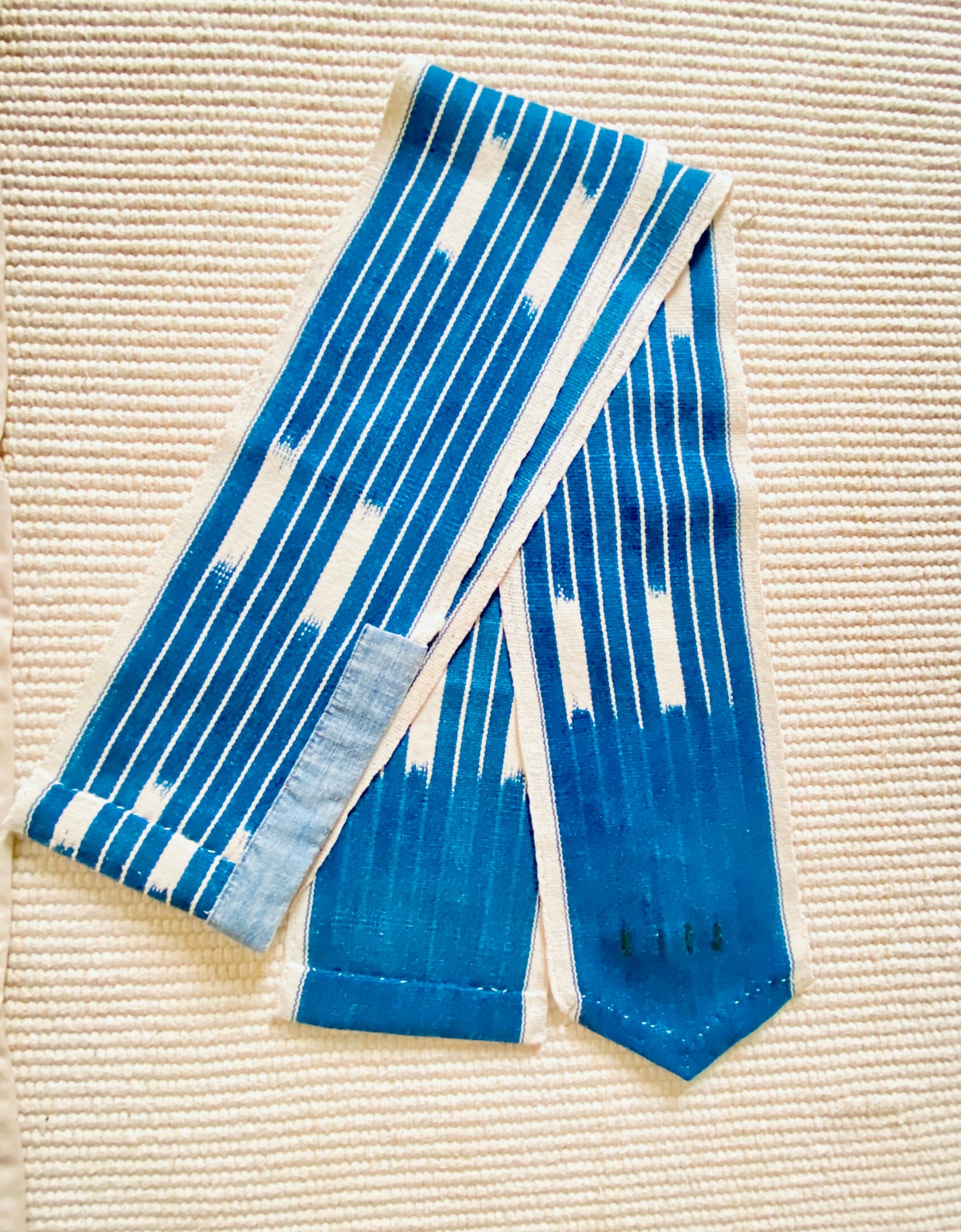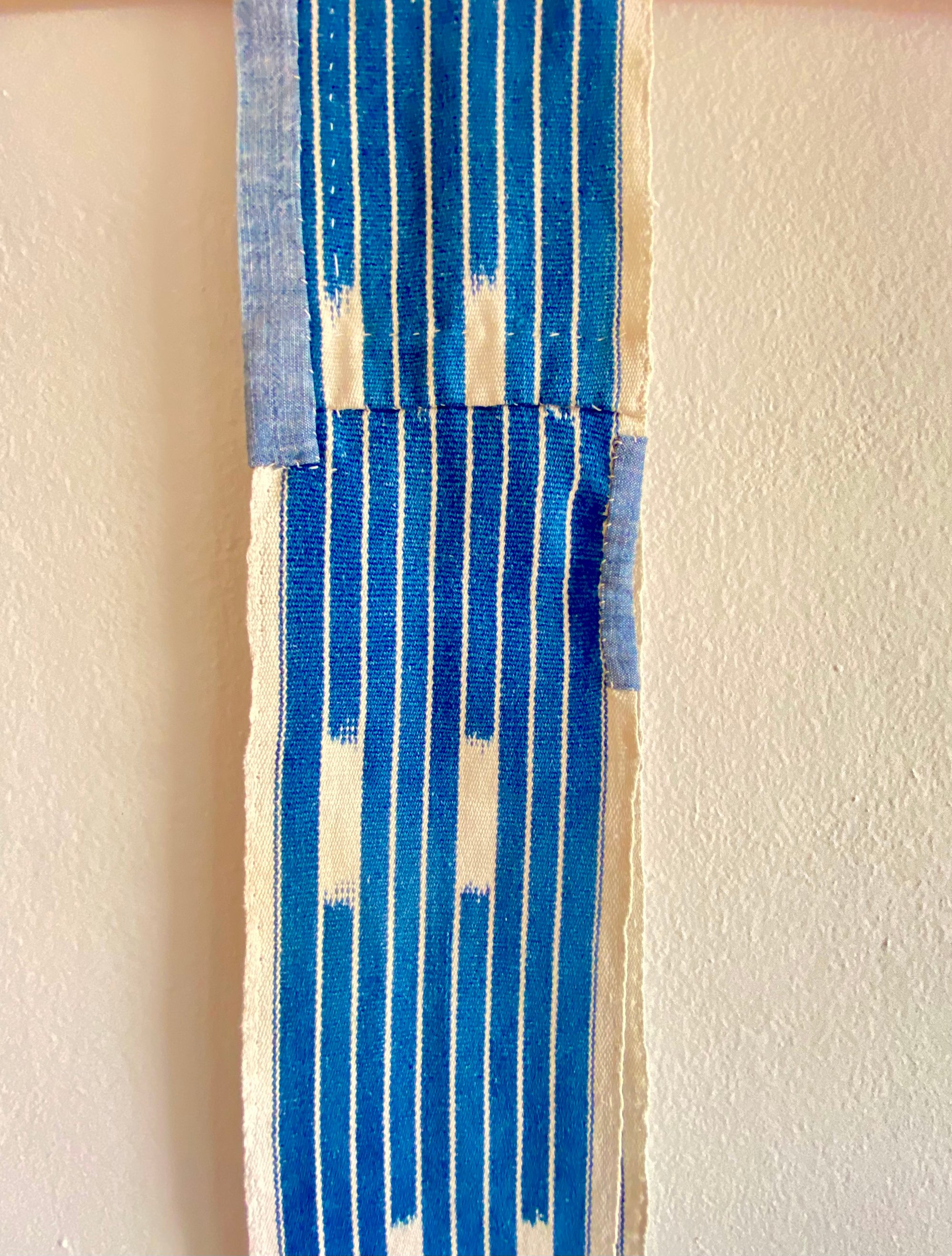 Le tissu, probablement originaire du Mali ou Burkina Faso, présente les irrégularités caractéristiques du tissage artisanal sur métier étroit : variations subtiles, traces de réserve, profondeur de l’indigo. Chaque fil porte le temps.