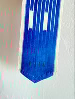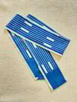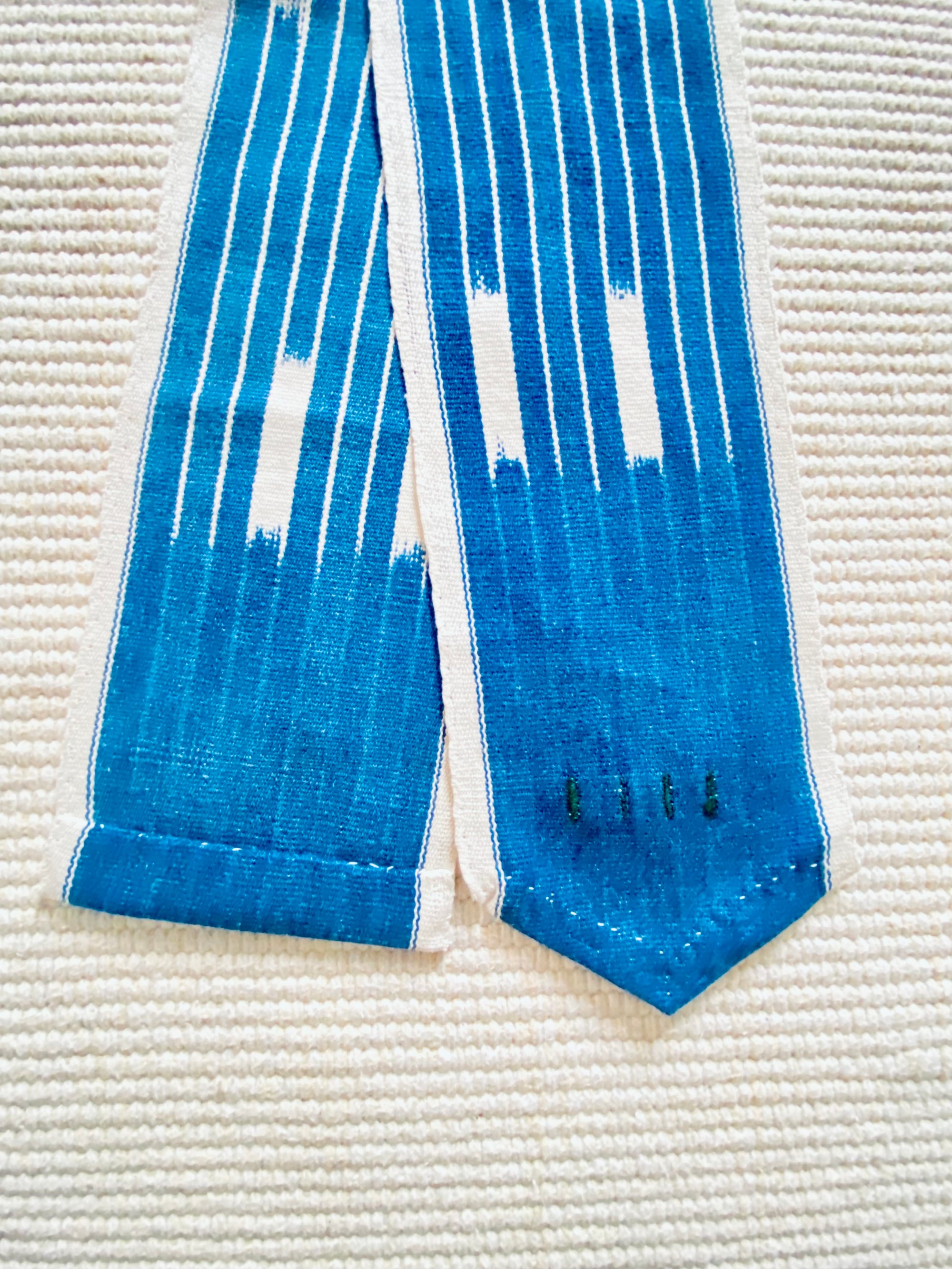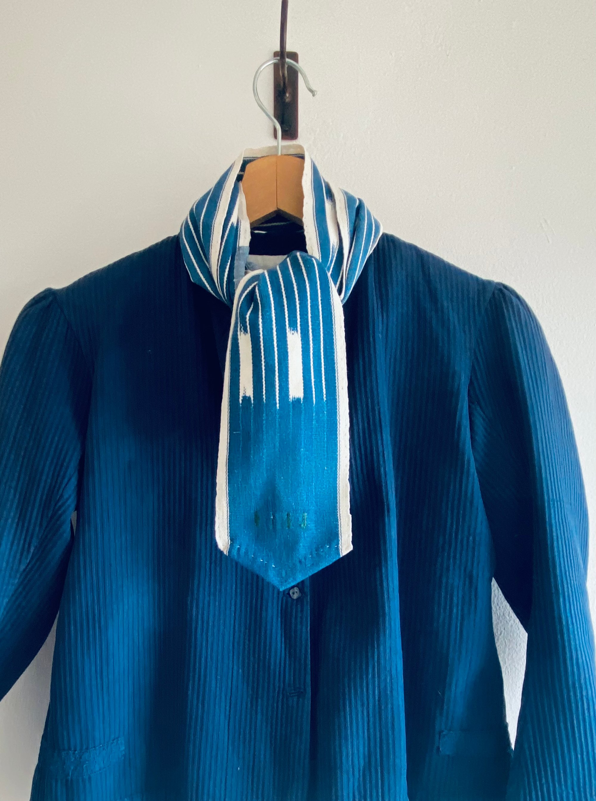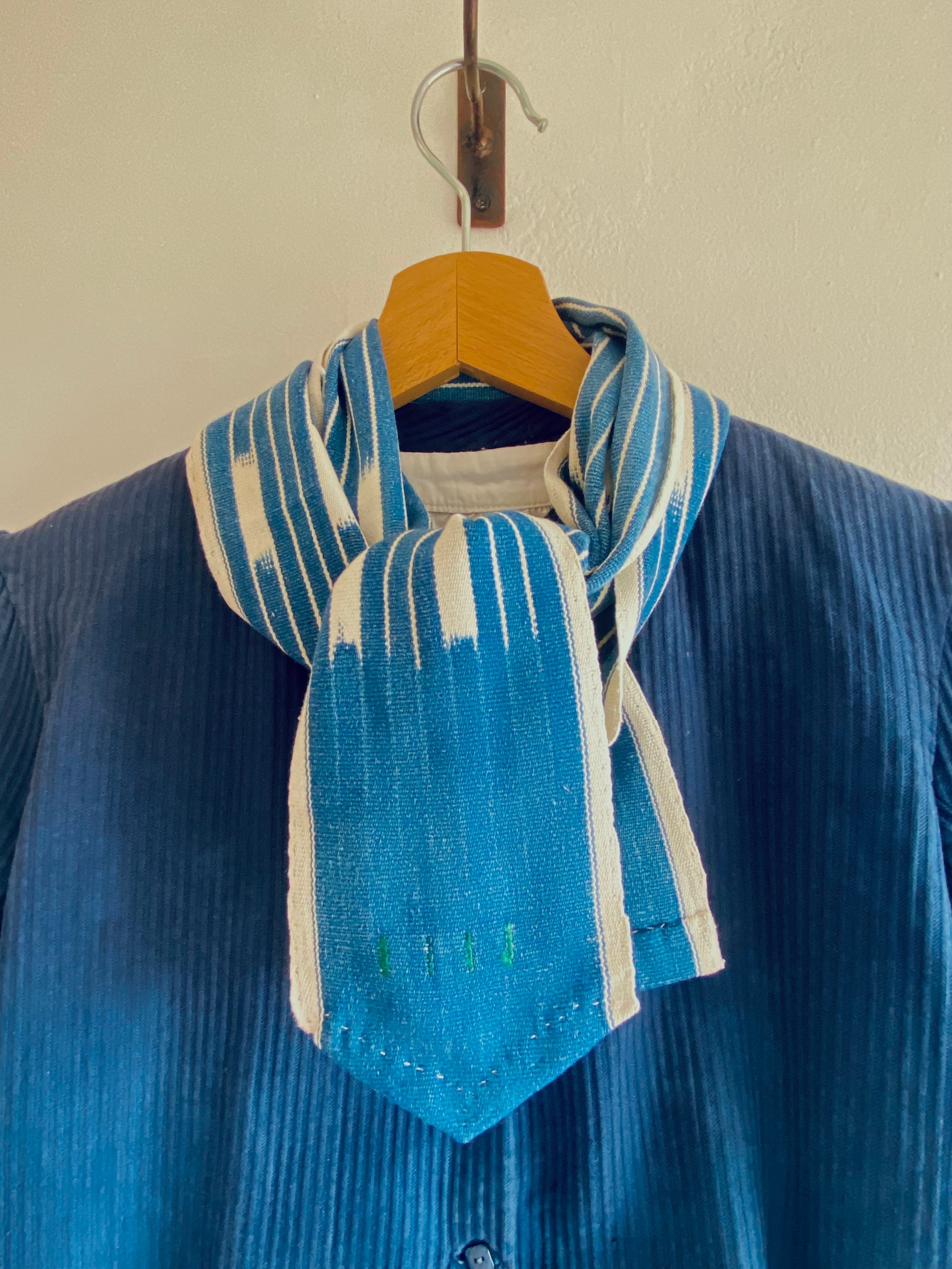 Le tissu, probablement originaire du Mali ou Burkina Faso, présente les irrégularités caractéristiques du tissage artisanal sur métier étroit : variations subtiles, traces de réserve, profondeur de l’indigo. Chaque fil porte le temps.