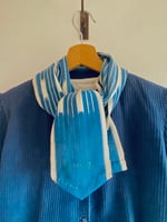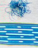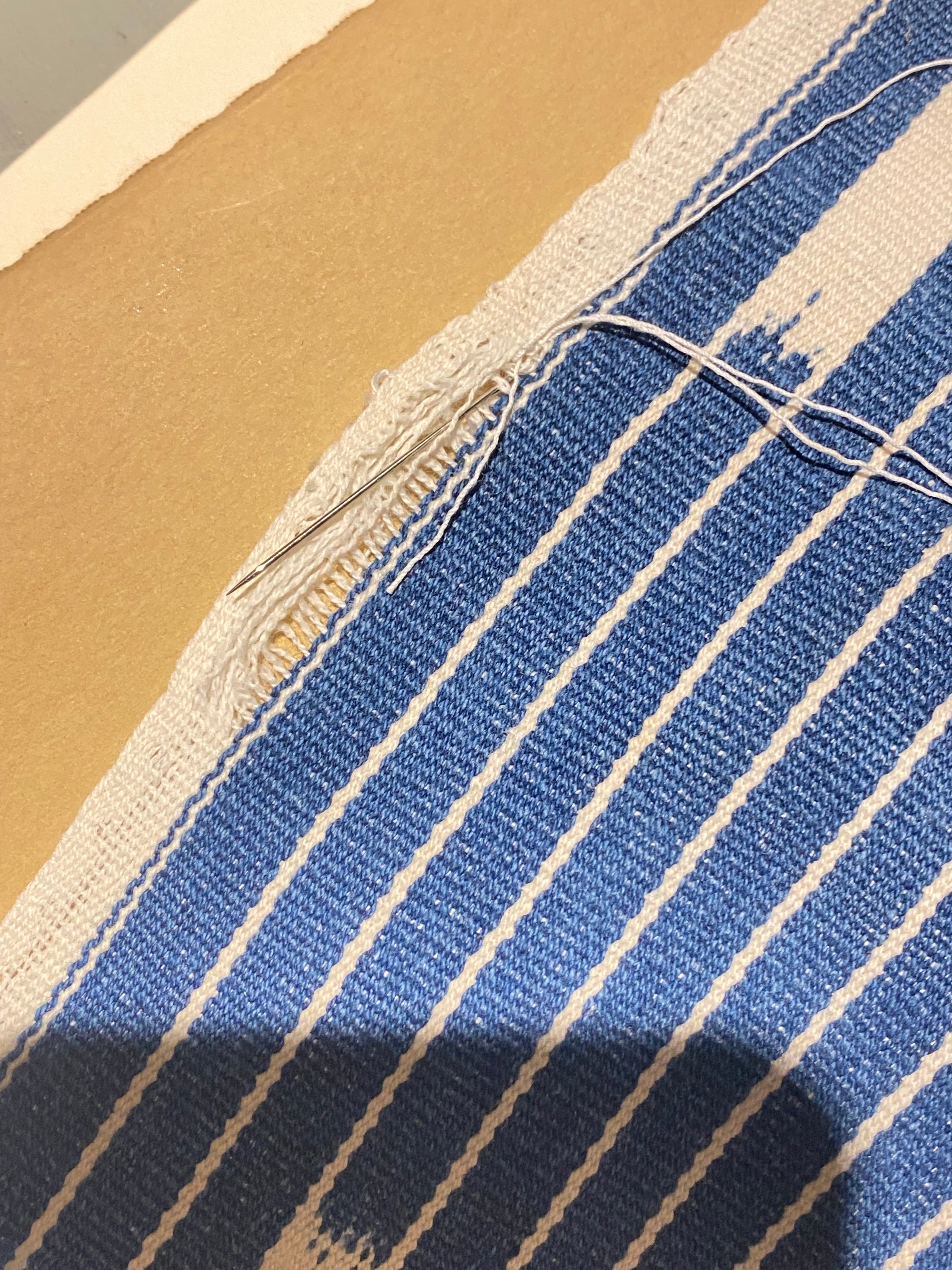 J’ai dû effectuer des réparations de renfort avec des pièces en chambray très fin, qui se marient avec la couleur de l’ensemble. La couture est volontairement visible, réalisée lentement, dans un esprit de réparation douce et de respect du textile ancien.