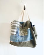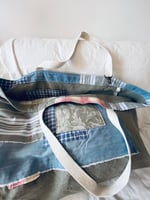 Large handmade tote bag crafted from vintage and reclaimed fabrics.